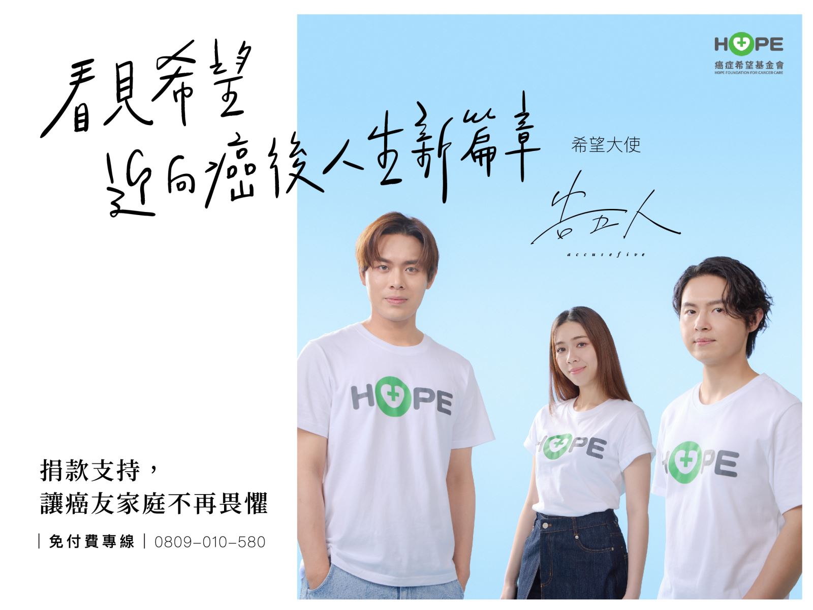 基金會很榮幸邀請到超人氣樂團「告五人」擔任本次公益行動的希望大使,邀請大家一同支持癌友勇敢重生。此次廣告以告五人歌曲《運氣來得若有似無》描述人生中的不確定性與無常,帶有對命運的順從與釋然,呼應癌症病友面對生命的未知與挑戰,學會在不確定中前行!現在就加入我們的行列,用一份捐款,為癌友與家庭注入希望,幫助他們走過幽谷,開啟人生第二幕。